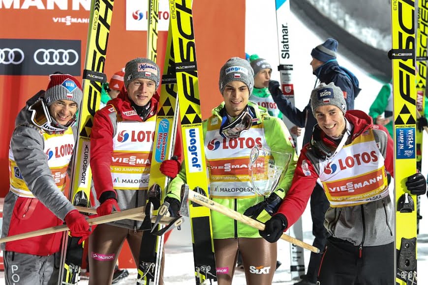 Reprezentacja Polski w skokach narciarskich ze złotym medalem Mistrzostw Świata w Lahti. Read More